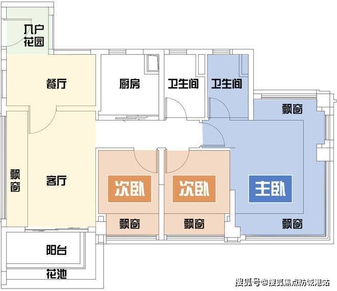 ①空间升级:三房设计比传统户型多1房、约3.4米客厅开间、带入户花园