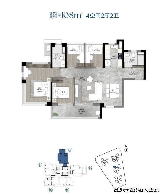 108㎡四房两厅两卫(熙澄户型):改善型主力户型,采用横厅设计,阳台开间达5.95米,空间阔绰通透。南北双阳台设计增加通风采光效果,四个房间均具备充足使用空间,适合二胎家庭或三代同堂。