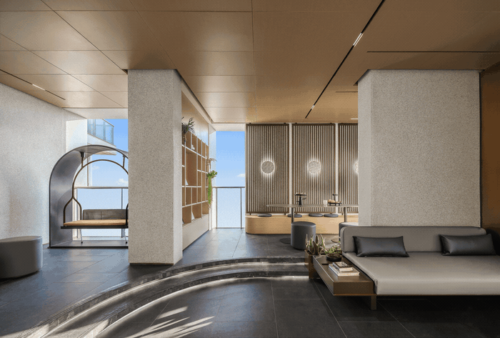 首先,社区入口的“海上会客厅”设计感很强,极具辨识度,提升了归家的仪式感。其次,项目在部分楼栋创新性地采用了“双大堂”设计。首层大堂做到了约9米挑高,这种酒店式的入户空间,在南沙区域并不多见,极大地提升了回家的第一感受和社区的质感。二楼还设置了包含茶艺室等功能的接待大堂,丰富了社区会客与社交的场景。