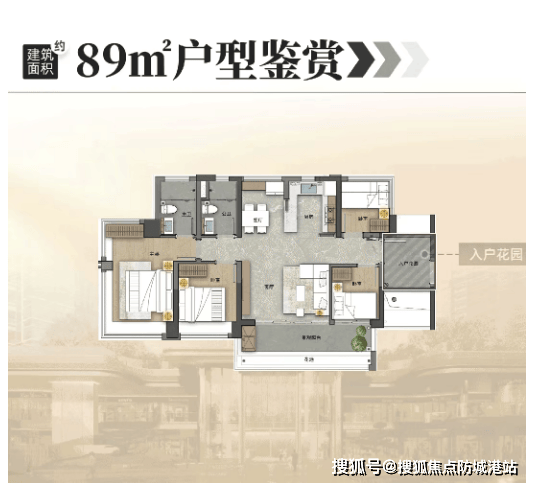 建面约89㎡户型:改善进阶之选,五空间两厅两卫设计,采用横厅布局,实现南北对流,通风采光更优越。餐厅带飘窗,主套三面环幕采光,全屋采光性能极佳,空间布局合理,动静分区清晰,避免家庭活动相互干扰;入户花园、270°环幕飘窗等亮点一应俱全,实际使用率高达130%,既能满足三口之家的居住需求,也能兼顾偶尔的亲友来访,实用性与舒适度双在线。