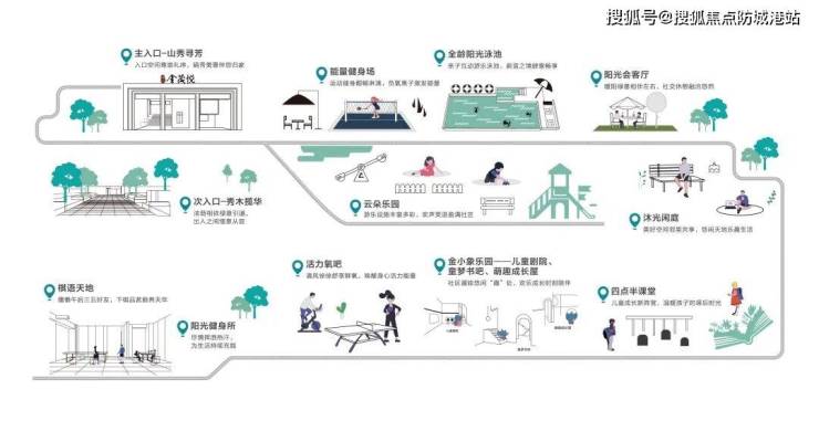 室外7大主题空间:阳光会客厅、全龄阳光泳池、能量健身场、云朵乐园、沐光闲庭、山秀寻芳、秀木揽华