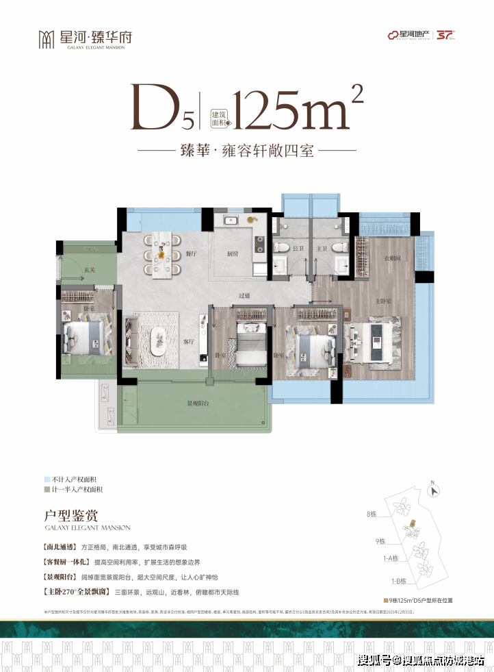 125㎡四房:双套房配置,主卧270°飘窗,景观面超8米