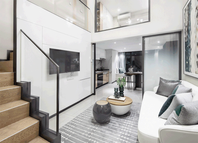 其中49㎡两房两厅一厨一卫设计,非常适合投资或是小家庭自住。入户即是大入户玄关,推拉式电视柜、嵌入式冰箱,全屋隐藏式收纳设计,小面积大使用。