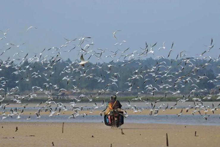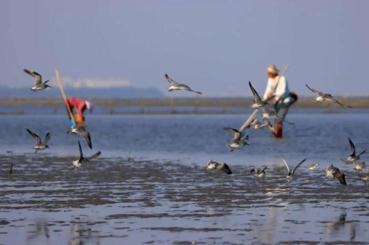 本村人岸上住,习惯了候鸟叫声,村民对候鸟非常友好,从不干扰侯鸟休息,赶海时避开侯鸟休息处走,人在前耙螺,鸟在后捡漏,构成了一幅和谐共处画面