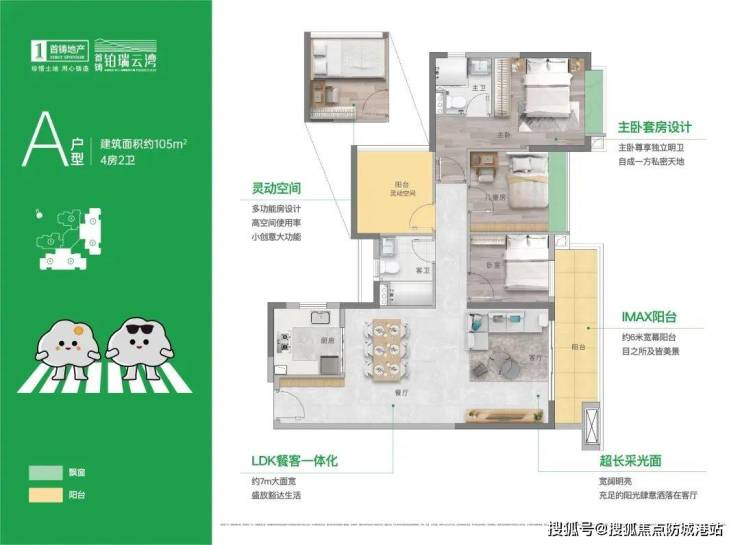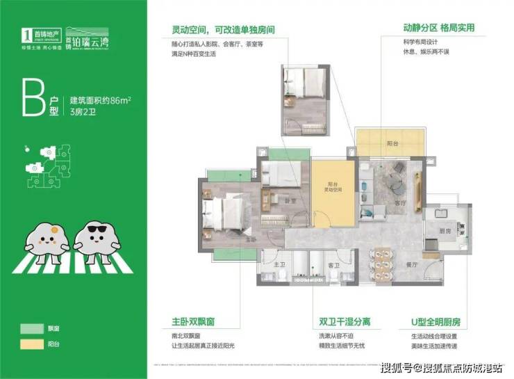 * **【艺术与功能】**:建筑风格现代简约。户型有86-152㎡奢适多功能N+1房,设计有人性化的1梯2户、2梯3户、2梯4户和2梯6户产品,多为南北对流、双阳台设计、动静分离、多面采光。