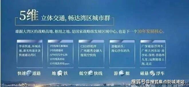 低空快线:CBD停机坪(广州越秀金融大厦低空快线)轨道交通:3号线、5号线、APM线、18号线、13号线(建设中)广深磁悬浮(规划中)快速路:华南快速、环城高速、新光快速多条快速通达湾区游艇码头:海心沙东码头(可停靠游艇半小时)