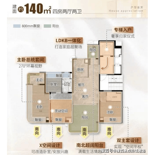 120平方米四房:南向四开间,配备约6米阳台,主卧拥有270°全景舱。