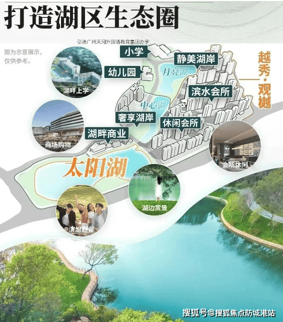 项目内自配一所15班幼儿园和一所24班小学,并引进了广州天河外国语教育集团进行合作办学。该小学毗邻月亮湖,设计上融合了山林湖自然意境,打造了一座现代山水书院。周边还有贝赛思、爱莎等顶级国际学校,教育资源丰富。