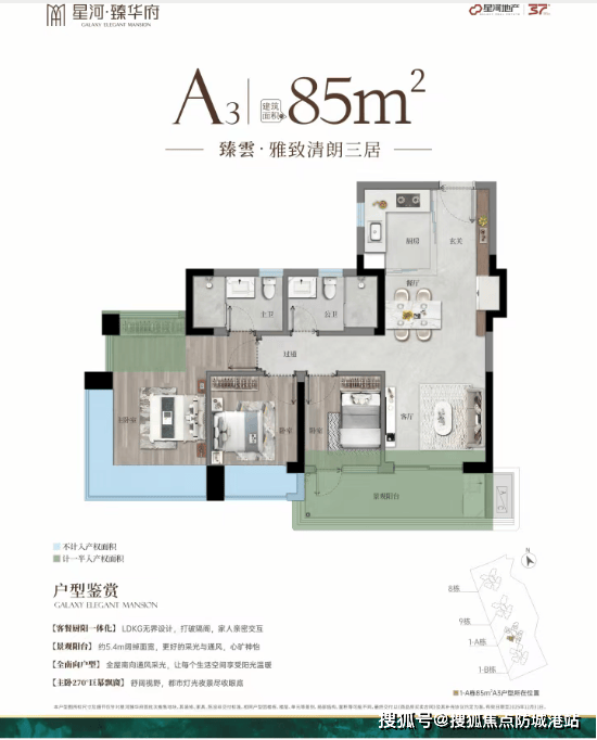 85㎡三房户型,是项目的刚需入门级产品,也是首开楼栋的主力户型之一,适合新婚夫妻、单身高端白领或者三口之家。很多朋友会问,85㎡的三房,空间会不会很拥挤?使用率接近100%,真的能实现吗?