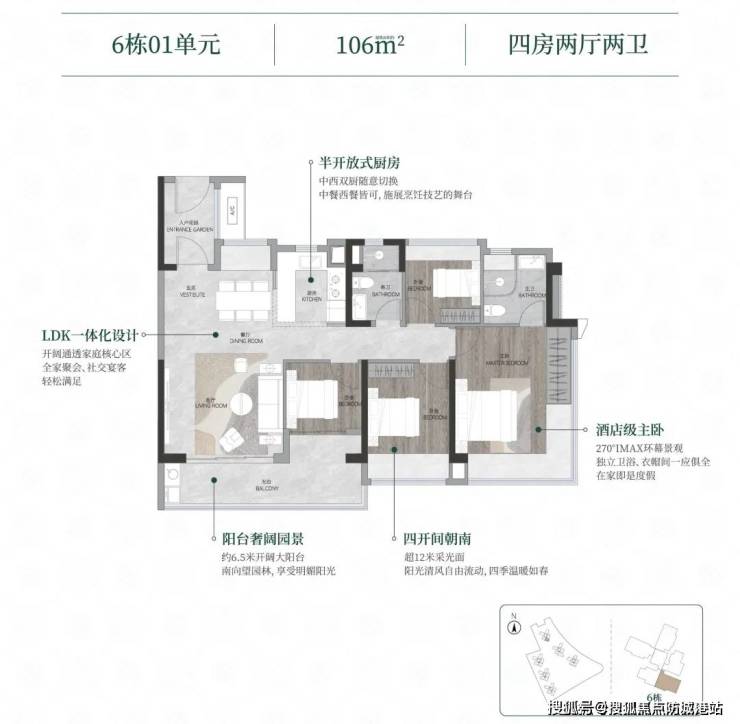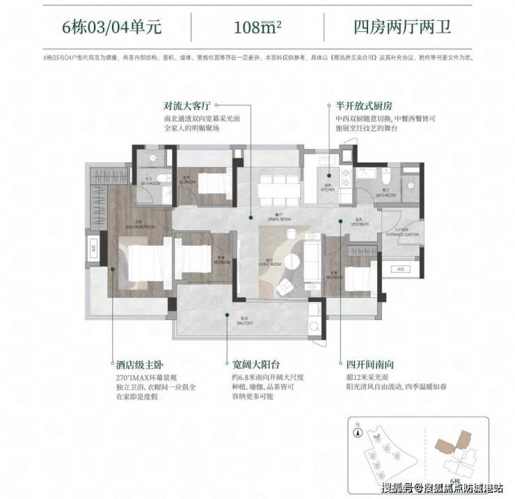 特点****:大横厅设计,面宽达6.8米,连接景观阳台,视野开阔;四房配置,适合二孩家庭或三代同堂;