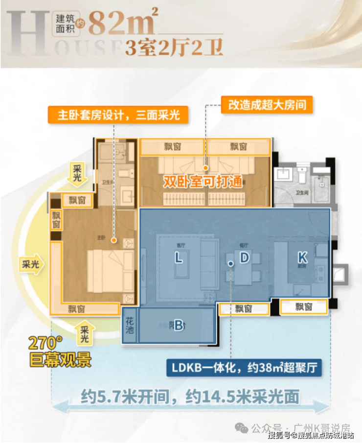 ——82㎡三房两卫:片区绝版横厅小户。作为板块内稀缺的横厅小户型,该户型南北对流,通风效果极佳,LDKB一体化设计让动区空间大幅提升,客餐厅开间达5.7m,营造出开阔敞亮的空间感。户型同样采用四开间朝南设计,采光面超11米,270度超大角度采光,可同时享受海景与园景双重景观,居住体验拉满。由于货量有限,仅1条梯腿供应,适合追求空间感与景观资源的刚需家庭。