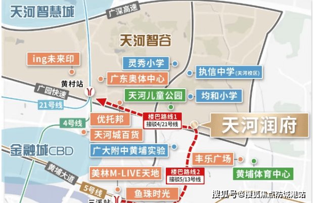 天河润府位于天河智谷板块,紧邻广园快速路,交通网络四通八达,可便捷到达珠江新城、金融城、琶洲等重要商务区。周边轨道交通发达,地铁4号线、21号线黄村站近在咫尺,并且规划有公交首末站,进一步提升了出行便利性。