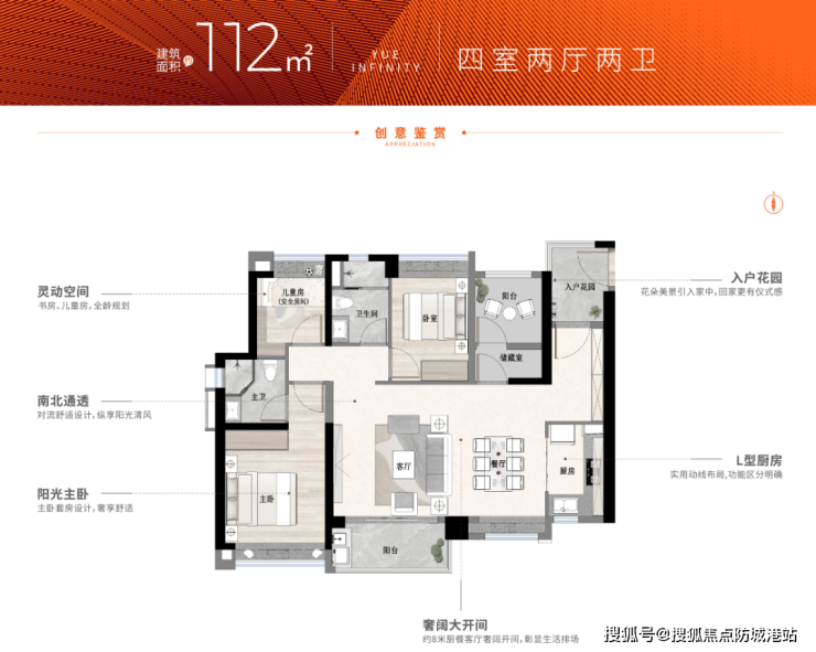 本次主推的107‑113㎡户型,是越秀地产对广州新计容规则的深度实践,实测使用率普遍超过130%。户型设计强调“复式空间的平层化”,特别是“臻藏稀缺复式产品”,拥有上下两层的灵动空间,单层层高约2.9米,隔音与舒适度极高。全系户型均采用LDKB(客厅、餐厅、厨房、阳台)一体化设计,配合入户花园与超大飘窗赠送,实现了“小面积、大空间”的居住革命。