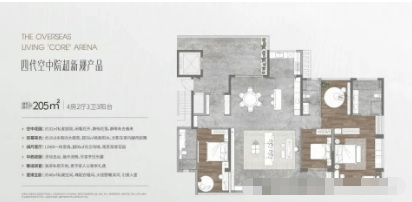 3. 建面约205㎡户型:四房大平层,终极改善户型。该户型是项目的标杆户型,实测得房率高达130%,实际使用面积约266.5㎡;户型格局方正,南北通透,纯南向设计,全天采光无死角;空中庭院面积约32㎡,6米挑高,可打造私家花园、休闲茶室等多种场景;主卧套房面积约30㎡,配备独立卫生间、衣帽间和观景飘窗,尊崇感拉满;客厅采用横厅设计,开间可达6米以上,连接超大海景阳台,一线海景尽收眼底,适合追求极致居住品质的高净值人群。