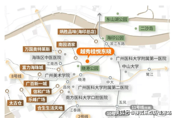 2. **交通配套**:交通优势显著,距离地铁8号线晓港站约700米,步行约10分钟可达。借助8号线,可直达老荔湾、琶洲、客村等地,在昌岗站换乘2号线能前往广州南站和越秀,在客村站换乘3号线可抵达珠江新城等商圈。乘坐地铁去琶洲7个站直达,去珠江新城通过换乘基本30分钟左右也可到达。自驾方面,家门口的东晓路以及周边的昌岗路、新港西路、内环等干线,使得开车前往东风东、琶洲、珠江新城一带在30分钟内均可到达。无论是地铁出行还是自驾,该项目都能满足居民高效出行的需求,在交通便利性上表现出色。