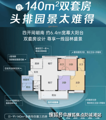 140㎡3+1 房 2 卫:改善优选,头排园景双套房户型,南北通透望园林,6.4 米大阳台拓展活动空间,双套间卧室设计提升私密性,四开间朝南,采光通风极佳,尽显品质生活。