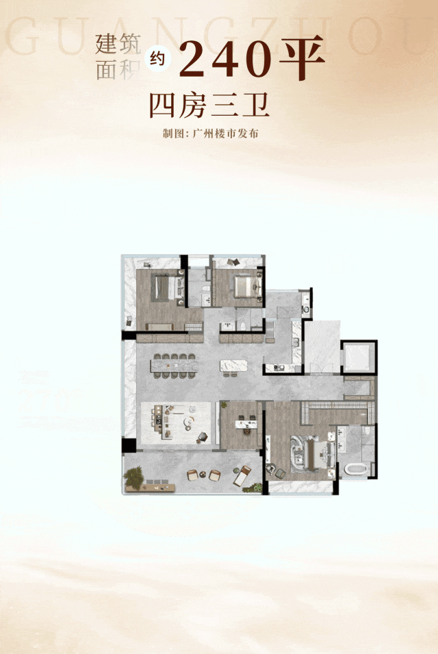 T5 栋楼王为独栋单边位板楼,建面约 240㎡,南向且三面采光,专梯专户设计。分为东边户、西边户两个户型,共 29 层,3 层起步,约 54 套货量。西边户户型拥有双套房、南北双阳台与中西厨,享有 270° 云山观景面,约 21 米的景观视野,可饱览西面白云山、南向广州中轴与园林、北向白云山与园景。