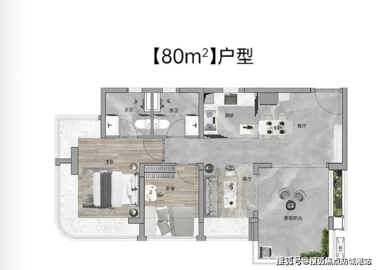 80㎡三房两卫:刚需首选,东南向看花园,三卧朝南,实用率超高,总价亲民,小家庭温馨之选。