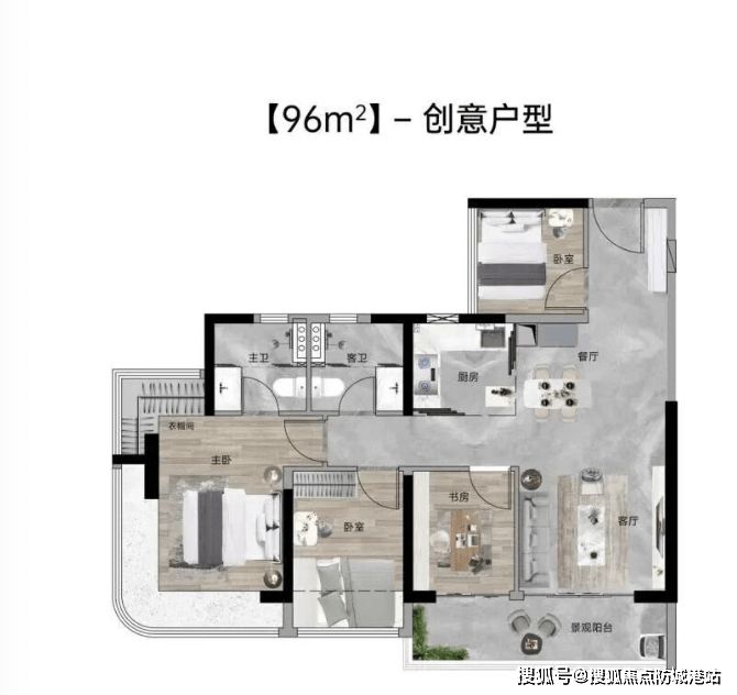 96㎡户型:80㎡升级版,入户多一室,阳台长达5.7米,景观视野开阔,生活更显从容。