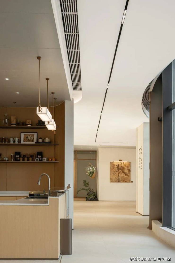 约 100㎡客餐茶一体化大通厅,高端圈层社交主场:户型采用客餐茶一体化的无边界设计,客厅、餐厅、茶室、西厨完全贯通,形成了约 100㎡的超大公共社交空间,空间尺度奢阔,视野开阔,完全打破了传统户型的空间局限。客厅面宽达到约 8 米,可打造家庭影音室、会客厅;餐厅可容纳 12 人位的大型圆形餐桌,满足大型家庭宴请、商务接待的需求;茶室与客厅相连,可打造开放式的品茶、会客空间;西厨与餐厅相邻,可打造水吧、酒柜,满足西餐、简餐、酒水饮品的制作需求。整个公共空间既可以满足大家庭的日常居住需求,又能作为高端圈层的社交主场,完美适配城市层峯人士的社交与生活需求。