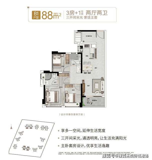 88㎡3房+1空间2厅2卫分为竖厅和横厅两种户型,均为热销爆款,同样是晋阶天河的首选。竖厅户型有南向、北向两种选择,经典竖厅设计,实现卧室与客餐厅动静分区,避免生活干扰,三开间采光,可直接眺望中央园林景观,享受超百米楼间距带来的开阔视野,+1空间可灵活利用,满足家庭多元需求;横厅户型为单边位布局,南向望中央园林,阔绰横厅设计实现南北通透,通风采光俱佳,约11米南向四开间,主卧为奢阔套房设计,配备独立卫浴,兼顾舒适度与私密性,无论是刚需家庭还是刚改家庭,都能得到良好的居住体验。