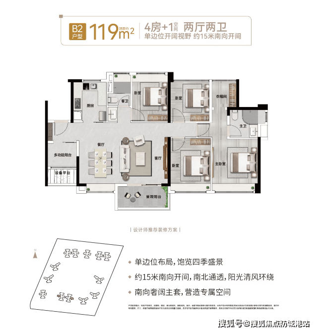 119㎡4房+1空间2厅2卫分为横厅和竖厅两种户型,是轻奢改善换房的首选。横厅户型为单边位布局,南北通透,约15米南向五开间,通风采光俱佳,客餐厅空间开阔,+1空间可作为书房、儿童房或休闲空间,南向奢阔主套配备独立衣帽间,兼顾实用性与尊崇感;竖厅户型为经典设计,动静功能分区清晰,约3.1米层高,约10米南向三开间,采光充足,南向奢阔主套配备步入式衣帽间,双阳台设计,兼顾生活与景观,可满足多成员家庭的居住需求,让每位家人都能拥有独立的空间。