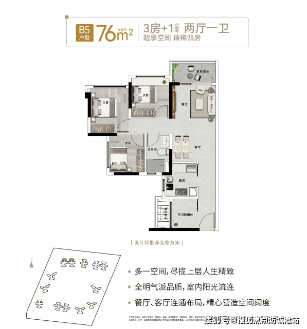 其中,76㎡3房+1空间2厅1卫是臻稀爆款小户型,也是晋阶天河的首选户型,总价320万起,性价比突出,适合预算有限的刚需家庭。该户型拥享自然山景,视野开阔无遮挡,客餐厅连通布局,有效拓展空间尺度,+1空间的设计让户型更具实用性,麻雀虽小五脏俱全,既能满足一家三口的居住需求,也能让业主以低门槛入驻天河,享受全维优质配套。