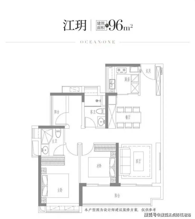 无论选择竖厅还是横厅,越秀江海潮鸣的96㎡户型都采用了经典的“飞机户型”布局。所谓“飞机户型”,是指主卧和次卧分别位于客厅的两侧,形似飞机的两翼。这种布局的最大优点是互不干扰,主卧的私密性得到了极好的保护,即使次卧有客人或孩子活动,也不会影响到主人的休息。同时,中间由客厅连接,保证了家庭成员之间的交流互动。这种设计在中小户型中尤为珍贵,因为它在有限的面积内实现了完美的动静分离和公私分区。