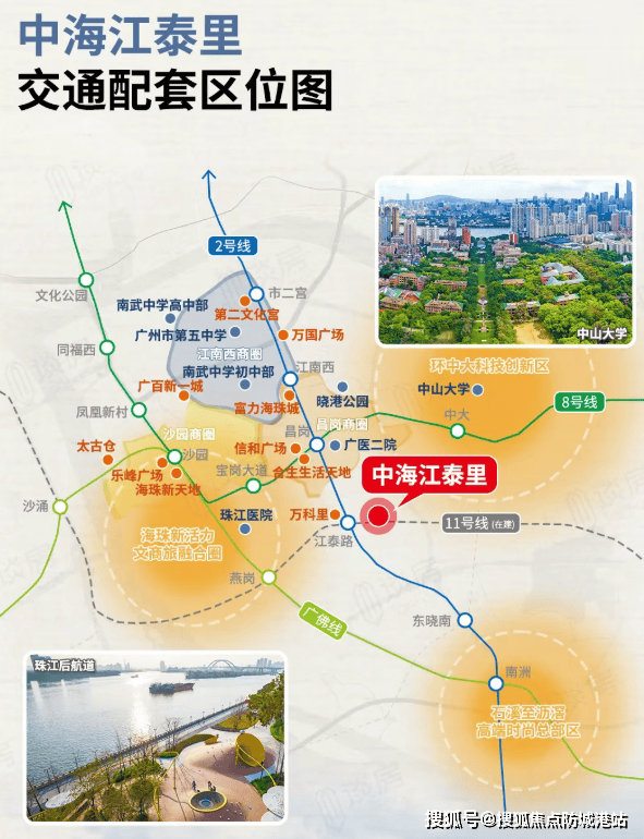 选址的智慧,决定了生活的广度。中海江泰里踞守海珠活力文商旅融合圈的核心位置,其交通优势堪称得天独厚。项目距离地铁2号线江泰路站仅约200米步行距离,真正的“出门即地铁”。对于都市通勤族而言,时间就是最宝贵的财富。2号线作为连接海珠、白云、越秀的交通大动脉,可直达海珠广场、公园前、广州火车站等核心枢纽;而正在建设的11号线则是贯通市区的大环线,未来将无缝衔接琶洲、金融城、天河北等经济高地。