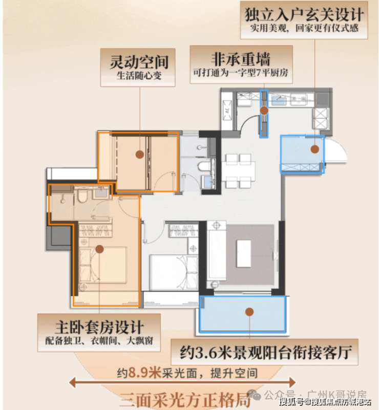 87平的小户型,乍一看可能会觉得空间有限,但经过巧妙的设计,竟然做到了“麻雀虽小,五脏俱全”。首先,它采用了少承重墙化的设计,这意味着次卧的空间可以根据需要进行灵活调整。比如,可以打通做成一个大房间,也可以隔开变成两个小房间,满足不同家庭结构的需求。其次,生活阳台与厨房打通,形成了一个约7平的全明空间,这不仅增加了采光和通风,还提升了空间的利用率。主卧配备了独立卫浴,实现了干湿分离,增加了私密性。要知道,在很多市面上的产品中,超90平才有主套设计,而87平就能做到,这已经非常难得。