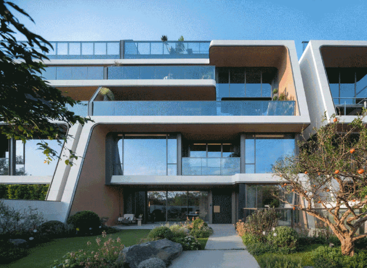 项目以围湖式规划构建自然生活场景,低密度布局、分院入户、私家院墙、一户一姓氏皆具仪式感。户型面宽达到10–14米,地下室通光处理引自然进入室内,形成全维度健康居住系统。
