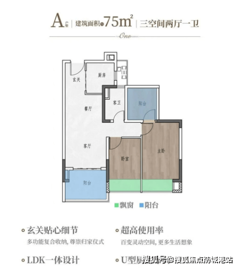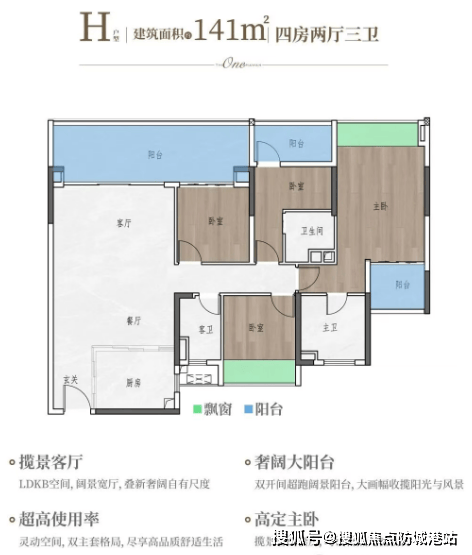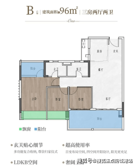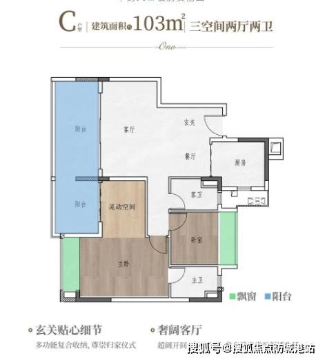 中等户型,适合小家庭居住。全户型贯彻“零公摊”设计理念,依托飘窗、设备平台等灵活拓展空间,提升居住舒适度。