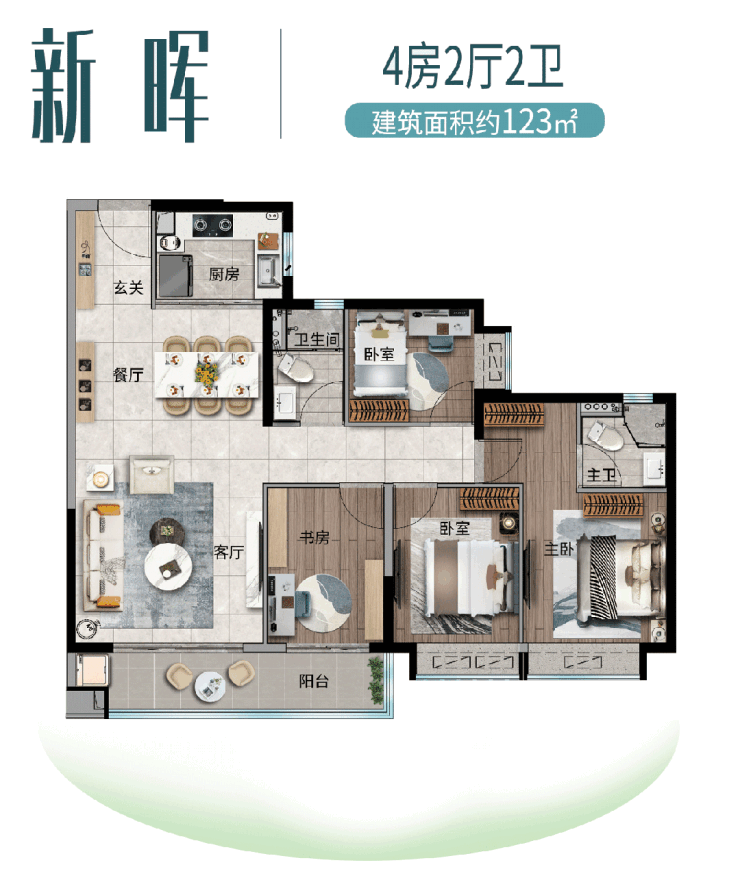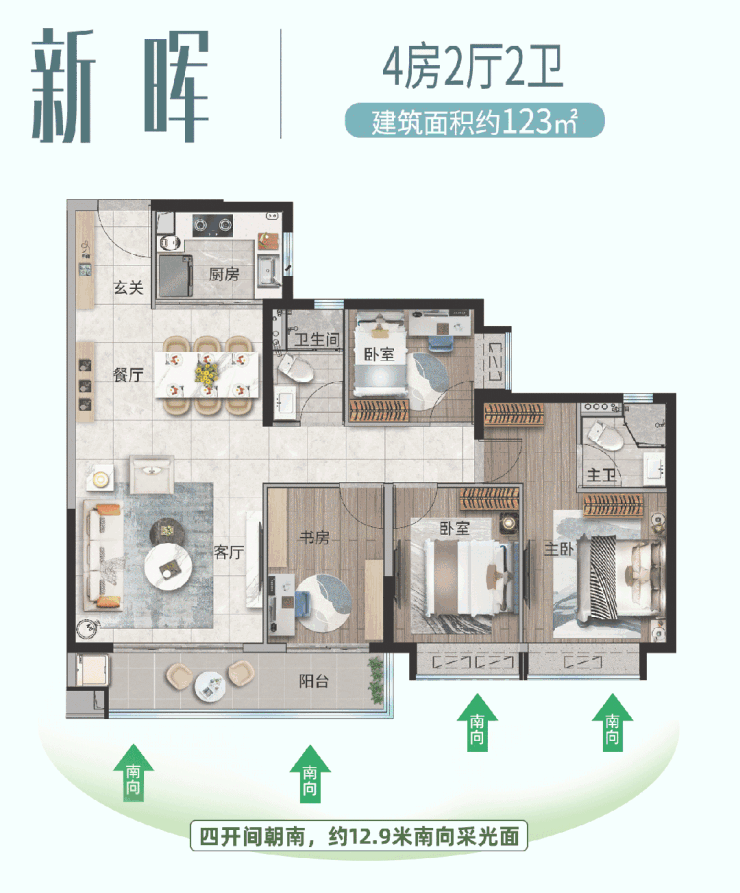 另一款建面约125㎡4室2厅2卫户型,是刚需向改善过渡的优质户型,适合人口较多的刚需家庭或刚改家庭。该户型同样采用南北通透、动静分离的设计,客厅连接南向全景阳台,江景与园林景观尽收眼底;主卧配备独立卫生间与全景飘窗,私密性更强,居住舒适度更高;四个卧室布局合理,均配备飘窗,采光充足,其中三个卧室朝南,一个卧室朝北,可灵活布置为儿童房、老人房、书房或客房,满足家庭不同需求;厨房U型设计,操作便捷,餐厅与客厅相连,空间通透,营造出宽敞明亮的居住氛围;公共卫生间干湿分离,配备高端卫浴设施,提升使用舒适度。该户型兼顾了实用性与舒适度,得房率高,既能满足日常居住需求,又能为家人提供充足的活动空间,是刚改家庭的优选之作。