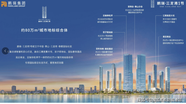 鹏瑞三龙湾壹号广场是一个集住宅、写字楼、酒店及商业于一体的超级综合体项目。整体建筑规划包括12万平方米的超甲级写字楼、2万多平方米的酒店及超过4万平方米的商业配套。两栋高达248米的超高层双子塔成为项目地标,体现了鹏瑞集团对高端品质的坚持。鹏瑞作为业内知名开发商,以精工细作著称,注重建筑与艺术的融合,致力于打造奢华且富有美学价值的居住环境。项目引入朗廷酒店品牌,深湾会佛山分会亦落址其中,提升整体社区的文化和社交品位,彰显鹏瑞三龙湾壹号的高端定位。