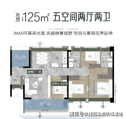 125㎡五房两厅两卫:实测套内面积约 115㎡,使用率 92%,4.5 开间朝南(南向面宽约 14.5 米),客餐厅南北对流,双面宽阳台(半赠送面积约 7.5㎡),全屋满飘窗设计(全赠送面积约 3.2㎡),满足三代同堂的改善需求。