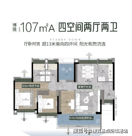 107㎡A 四房两厅两卫:实测得房率 92%,套内使用面积约 99㎡,4.5 开间朝南,客厅与主卧双南北对流,双面宽观景阳台(总面积约 6.2㎡),交互式方厅可灵活切换空间功能,适配二胎家庭。