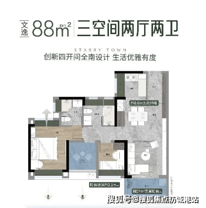 88㎡三房两厅两卫:实测套内面积约 79㎡,使用率 90%,罕见四面宽设计(南向面宽约 11 米),三卧室均朝南,270° 宽景阳台半赠送面积约 4.8㎡,精细化收纳系统配备约 10 米收纳墙,满足刚需家庭居住需求。