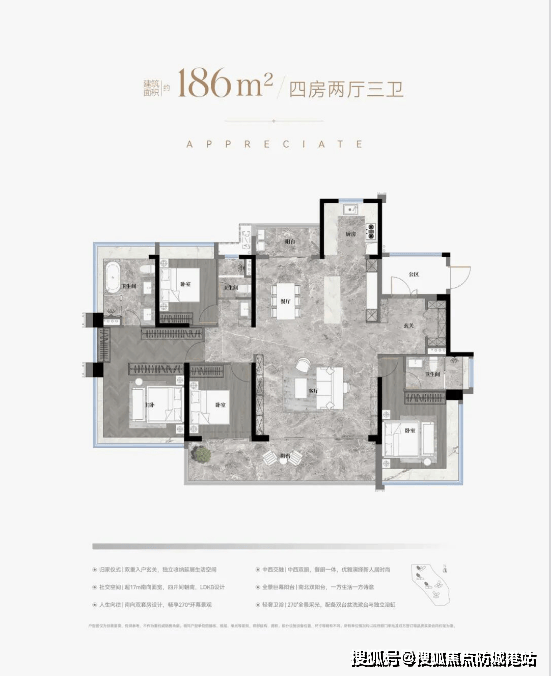 约186㎡ 四房两厅三卫:总价约900-1000万,楼王级产品,视野开阔。