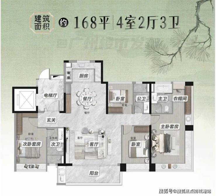 168方户型则达到了四开间朝南的标准,主卧带主套并配有270度观景飘窗,十字厅设计,四房三卫双主套,高级感拉满。叠加100%的使用率后,与市面上同级别的产品相比毫不逊色。