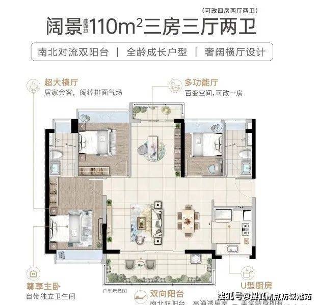 建面约110㎡四房:双主卧设计,南向景观阳台长达6.5米,满足三代同堂需求;