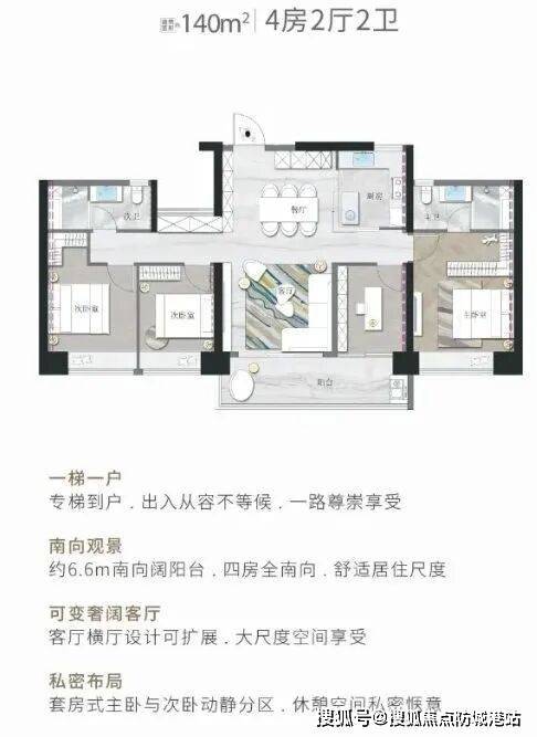 140㎡户型:通过16.6米南向面宽和五开间朝南设计,最大限度地引入阳光与景观,将顺峰山全景框入客厅。宽敞的空间布局,可满足改善型家庭对舒适居住环境的需求,无论是家庭聚会还是日常休闲,都能提供充足的空间。