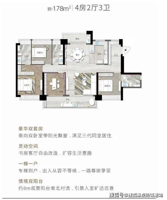178㎡户型:创新植入270°环幕飘窗,主卧巧妙设置浴缸与观景躺椅并置,营造出“泡澡赏云海”的奢侈场景。该户型注重居住品质与生活享受,为追求高品质生活的人群打造独特的居住体验,彰显尊贵与舒适。