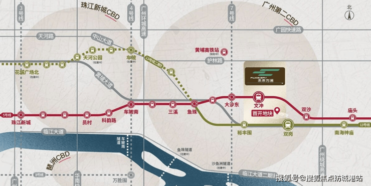 中建玖合·未来方洲的交通优势显著,项目紧邻地铁5号线文冲站和13号线双岗站,步行距离分别约为500米和300米,出行极为便捷。通过这两条黄金地铁线,居民可以直达珠江新城、金融城和琶洲等核心商务区。此外,周边还有多条城市主干道如黄埔大道、临江大道和中山大道等,进一步提升了通勤效率。