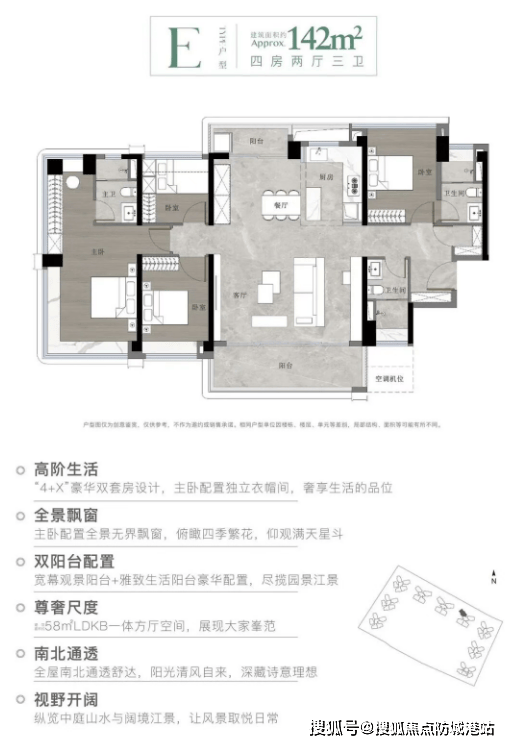 首开的文元组团共包含9栋住宅楼,分东西北三侧环绕分布,南侧留空便于采光。项目主打79平方米三房两卫、94平方米三房两卫、108平方米双套间四房两卫和142平方米双套间四房三卫四种户型,所有户型均为南向设计,使用率超100%。其中,改善型户型如108平方米和142平方米更是配备了三梯四户的超高层楼栋,确保每户都有大阳台和240度窗景,极大提升了居住舒适度。