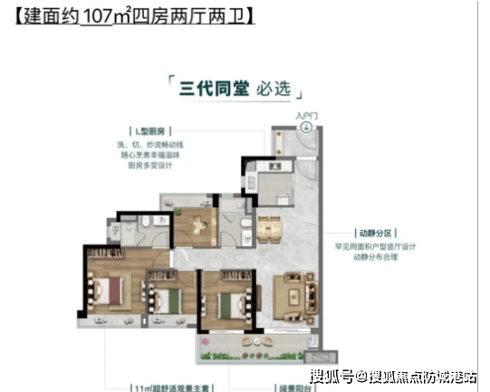 108㎡四房户型采用竖厅设计,客厅空间开阔大气,连接6.2米长的观景阳台,视野十分开阔,业主可以在阳台上摆放休闲桌椅,欣赏户外美景,享受惬意的生活时光。主套面积达到11㎡,空间宽敞舒适,配备独立的卫生间和衣帽间,为业主提供了私密、便捷的居住体验。该户型适合人口较多的改善家庭居住,能充分满足家庭成员的居住需求。