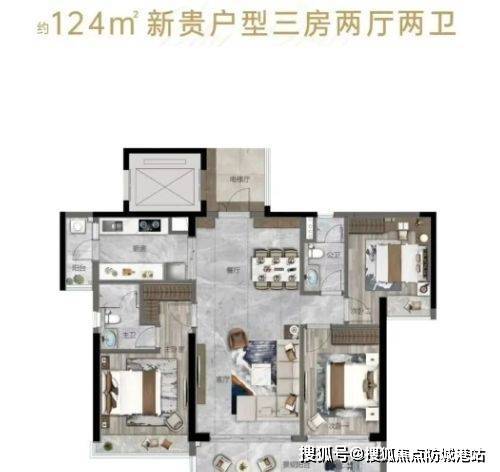 124-125㎡四房:南北通透,双阳台(生活+景观),主卧带L形飘窗,得房率约80%,LDK一体化设计,空间感强。