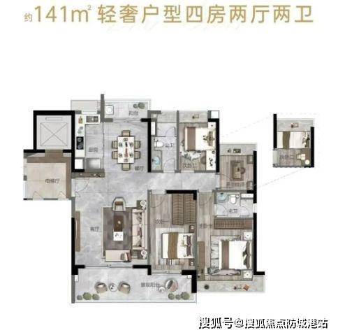 141-142㎡四房:约8.3米观景阳台,四开间朝南,主套带独立卫浴+衣帽区,适合二胎家庭。