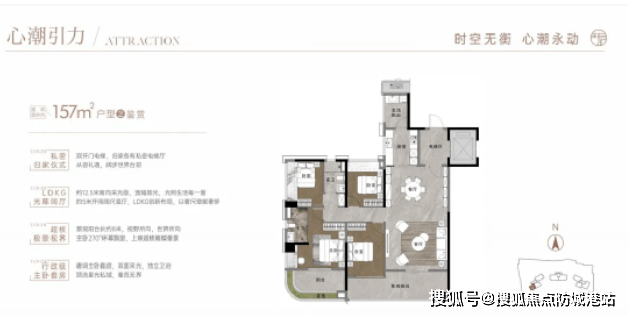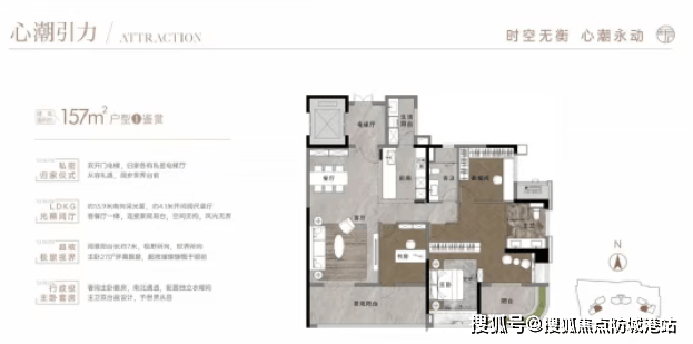 157平方米:四房两厅两卫,采用传统竖厅设计,动静分区明确。