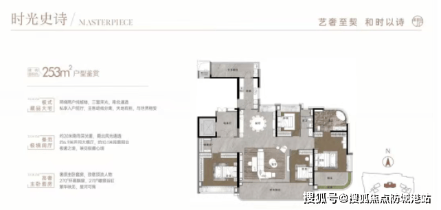 253平方米:南北对流,阳台长达10米,主卧飘窗和主卫均为270度弧形采光面,视野极佳。