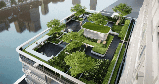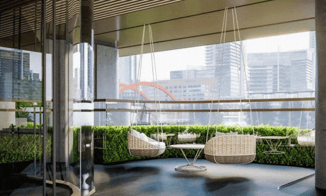 底部架空层4个花园,最高可达约8米,南北塔楼屋顶各1个云端花园,形成六重立体垂直花园,总面积约5630㎡。